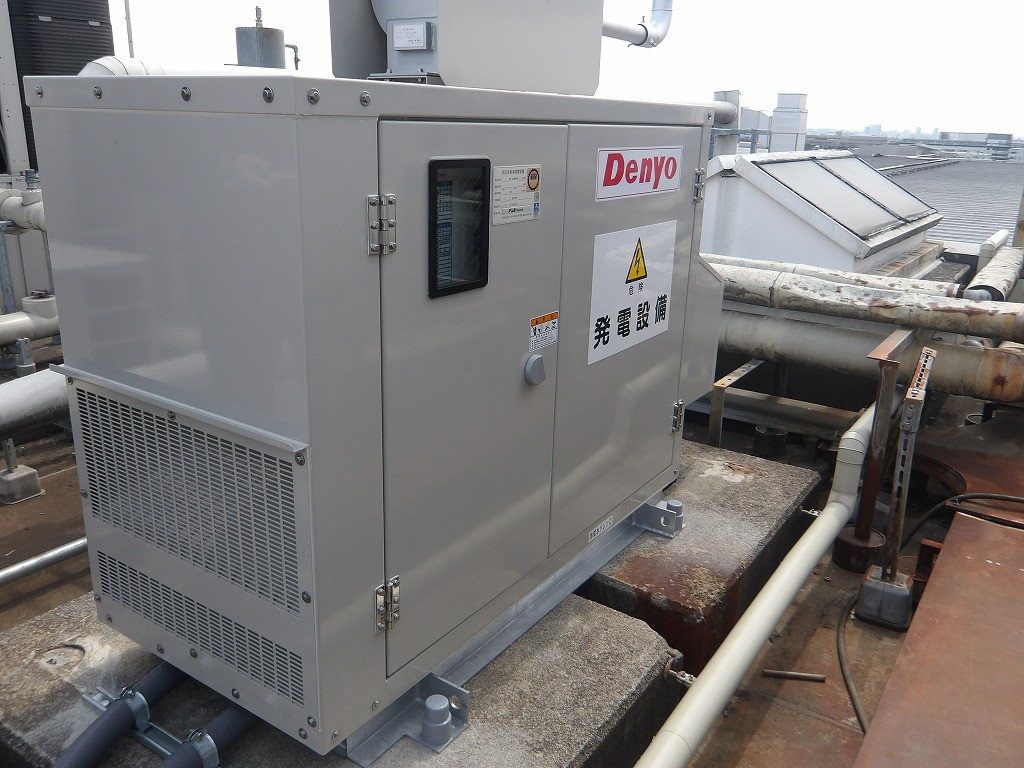 工場屋上で古くて起動不能になった発電機に消防負荷も入っており消防点検で不良となっておりました。既設発電機は大型で更新にはかなり費用がかかります。負荷を消防負荷だけに絞り専用にして発電機を設置することにしました。これで消防法もクリアです。